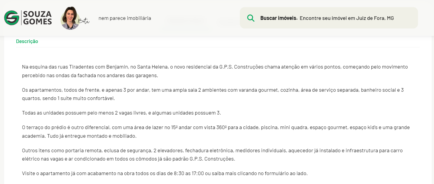 Com um tamanho variável, numa média de 4 parágrafos, a descrição é um dos diferenciais da empresa em relação à concorrência por ter um trabalho de curadoria por trás de cada imóvel. Cada opção é única e a descrição deve valorizá-la em suas melhores competências.