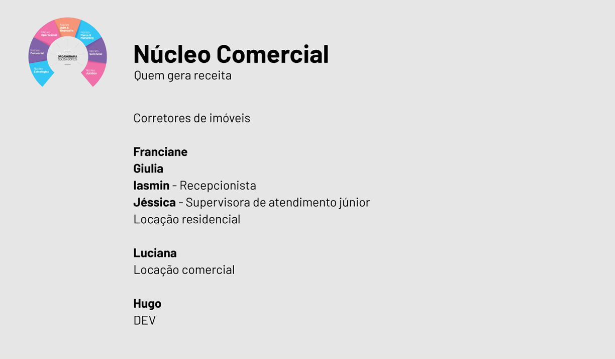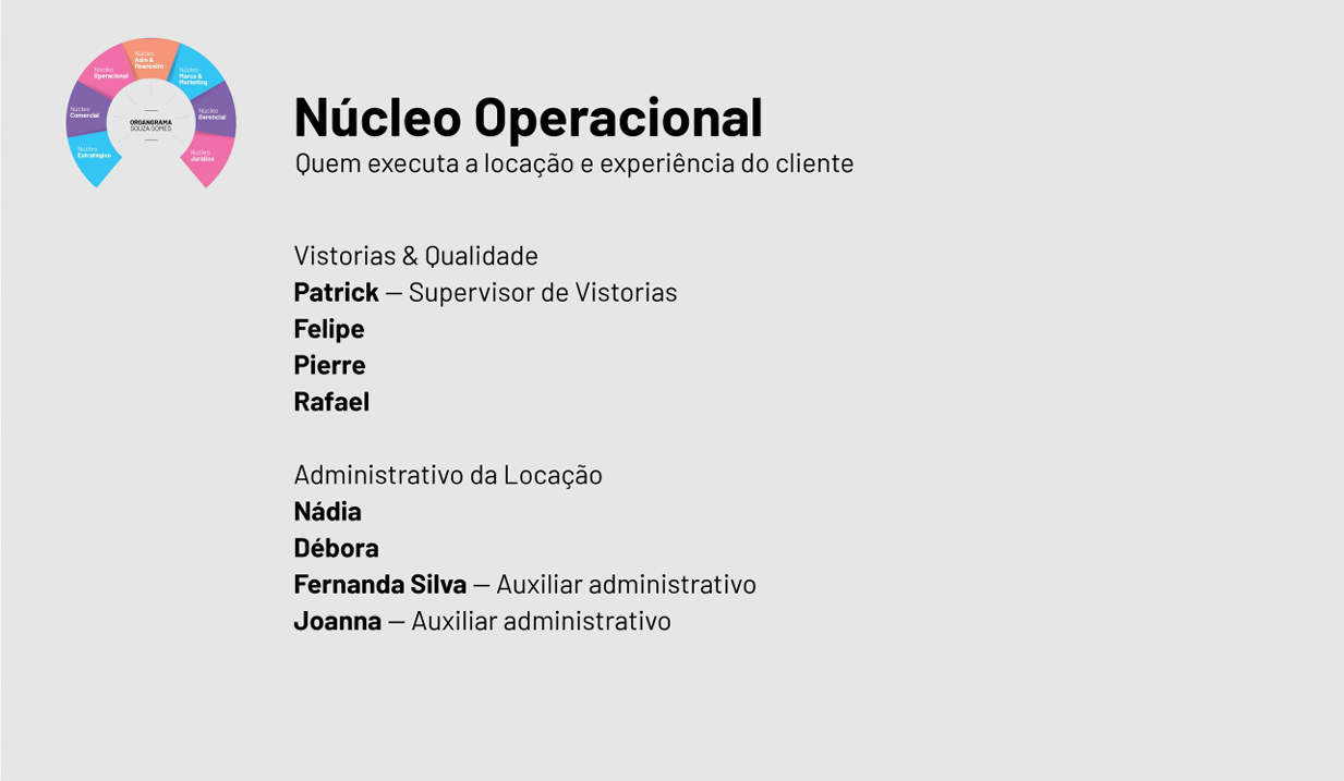 É a responsável pelos processos de locações e coordenação da equipe de aluguel e recepção, assim como acompanha de perto o andamento das atividades.