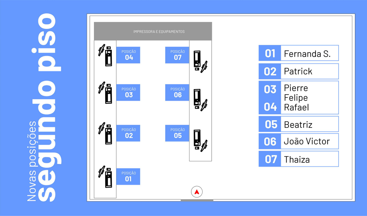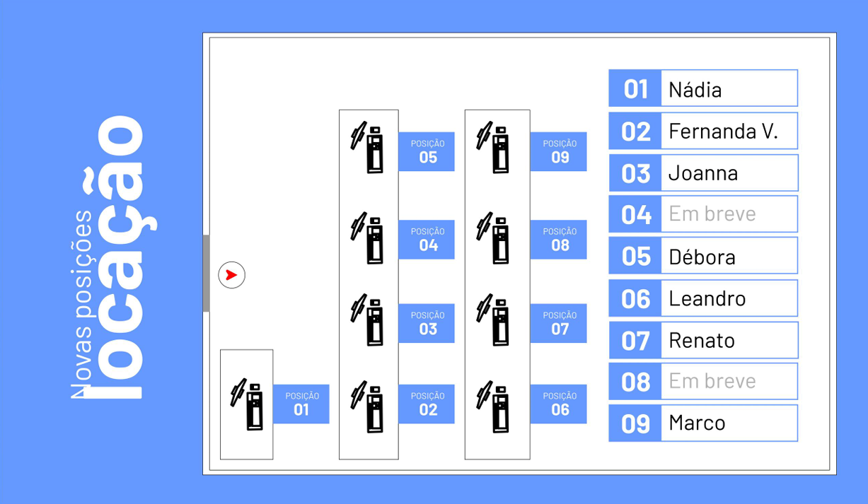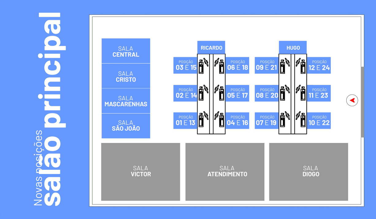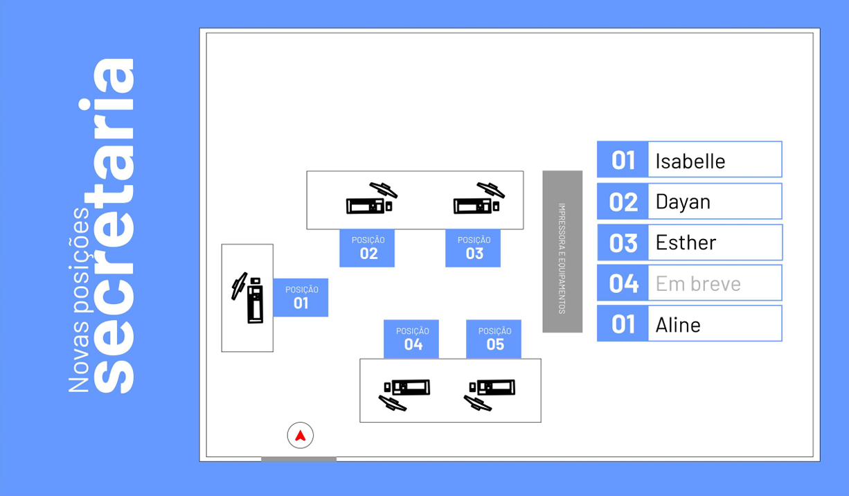 Os funcionários da locação e administrativo estão alocados em posições fixas em um espaço especial com cadeiras de atendimento.