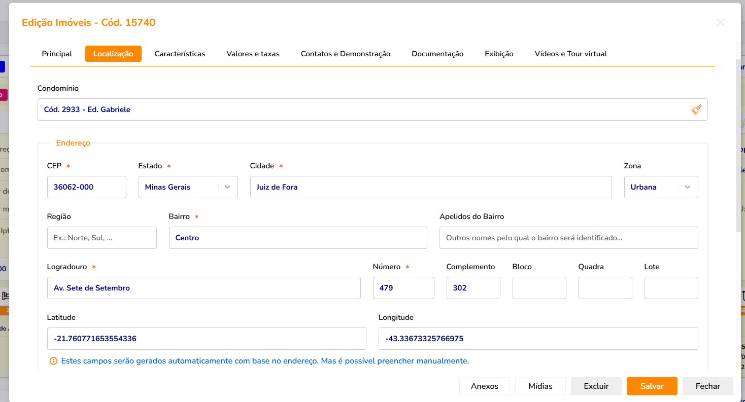 Nesta aba de LOCALIZAÇÃO, precisamos verificar se o condomínio está devidamente preenchido, CEP completo e correto, assim como a latitude e longitude do imóvel, sendo esses dados que fazem o imóvel aparecer corretamente no mapa que temos no nosso site.