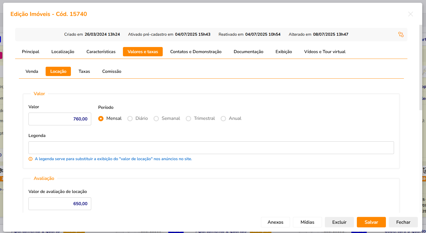 Aqui é para preencher com o valor de locação e a avaliação da captadora. É importante que ambos os campos estejam preenchidos.