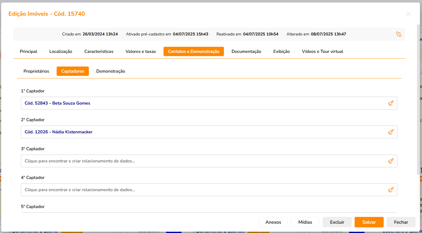 Proprietário sempre com seus dados completos (NOME, CONTATO E DOCUMENTO) e captadoras sempre preenchidos.