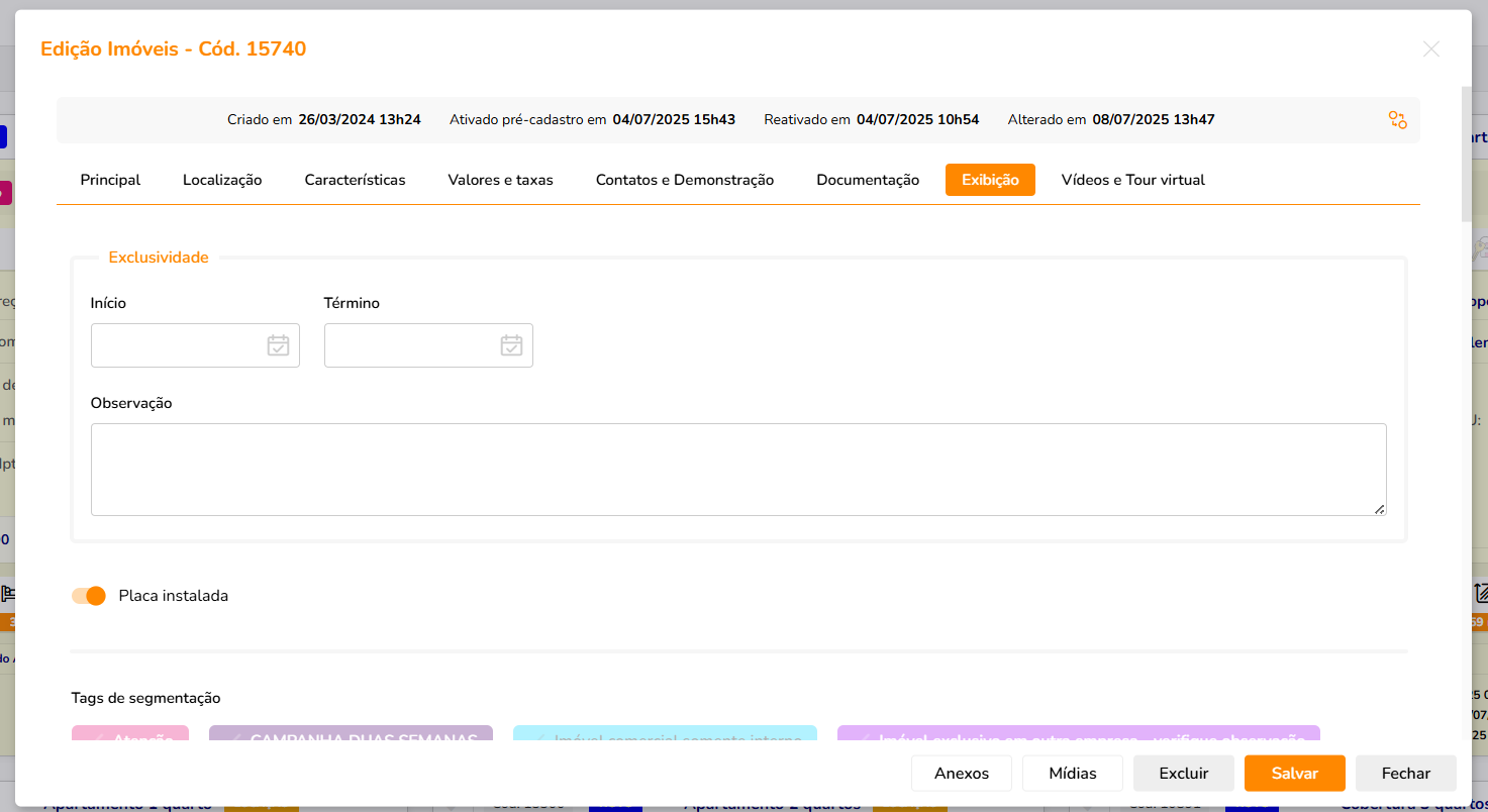 - A exclusividade, caso haja, deve estar sempre preenchida, assim como o campo de “placa instalada” e toda e qualquer TAG de Segmentação que se faça necessária. NESTA PARTE O MAIS IMPORTANTE SÃO OS CHECKS QUE DEVEM SER FEITOS NO SITE E NOS PORTAIS! PRECISAM ESTAR. SEMPRE MARCADOS EM REGRA GERAL.