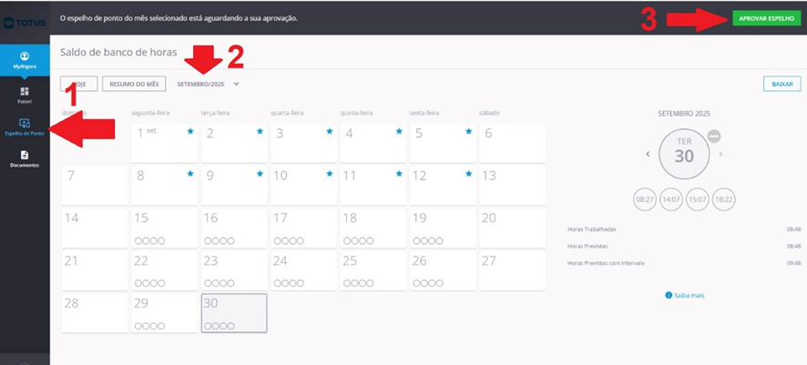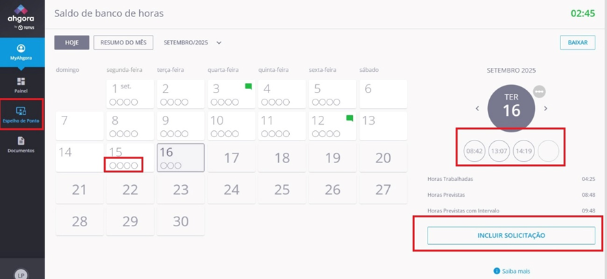 - Um dia completo deve conter 4 registros (4 batidas). Clique em cada dia e confira se os horários estão corretos.